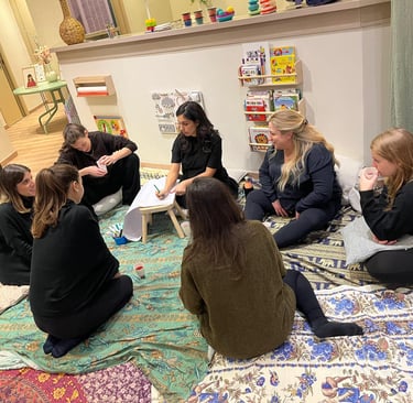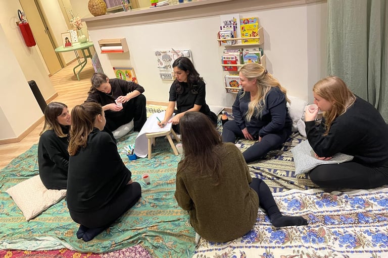 5 incontri in presenza + 1 online in cui affrontiamo diversi temi riguardanti gravidanza, parto e post parto.
